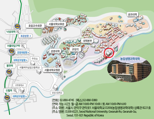 서울대 정문으로 오시는 경우 지하철 2호선 서울대입구역에서 하차하며, 호암교수회관 및 기숙사를 거쳐 후문으로 오시는 경우에는 낙성대역에서 하차합니다. 이 두 지하철역에서 서울대까지는 도보로 약 25~35분 거리이므로 버스나 택시를 이용하는 것이 편리합니다.